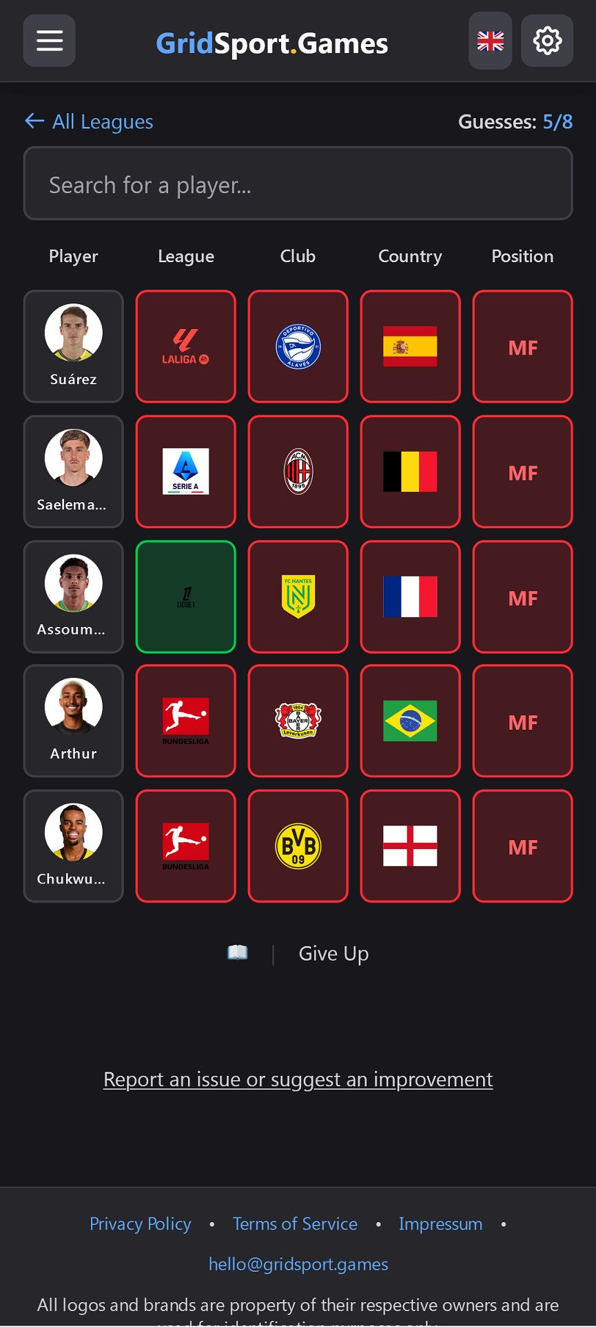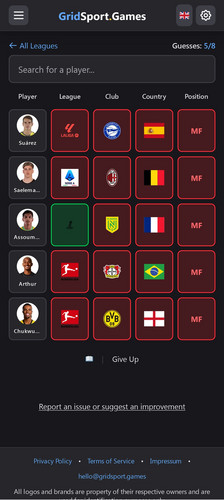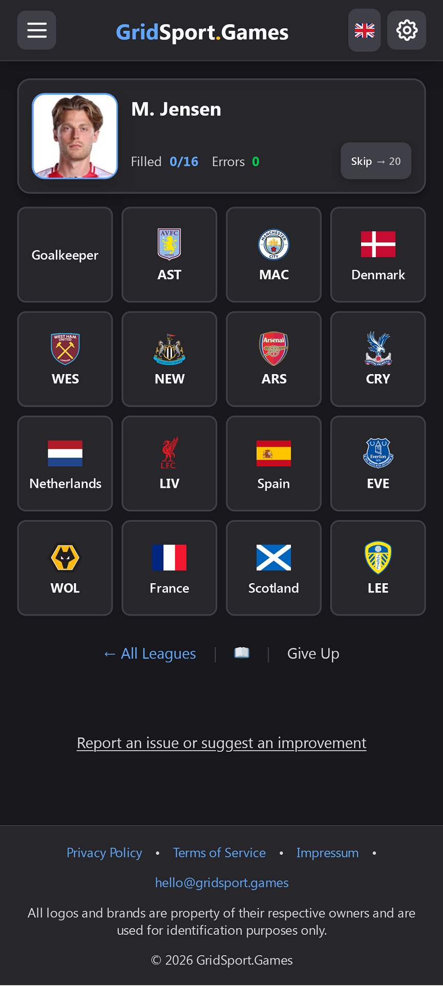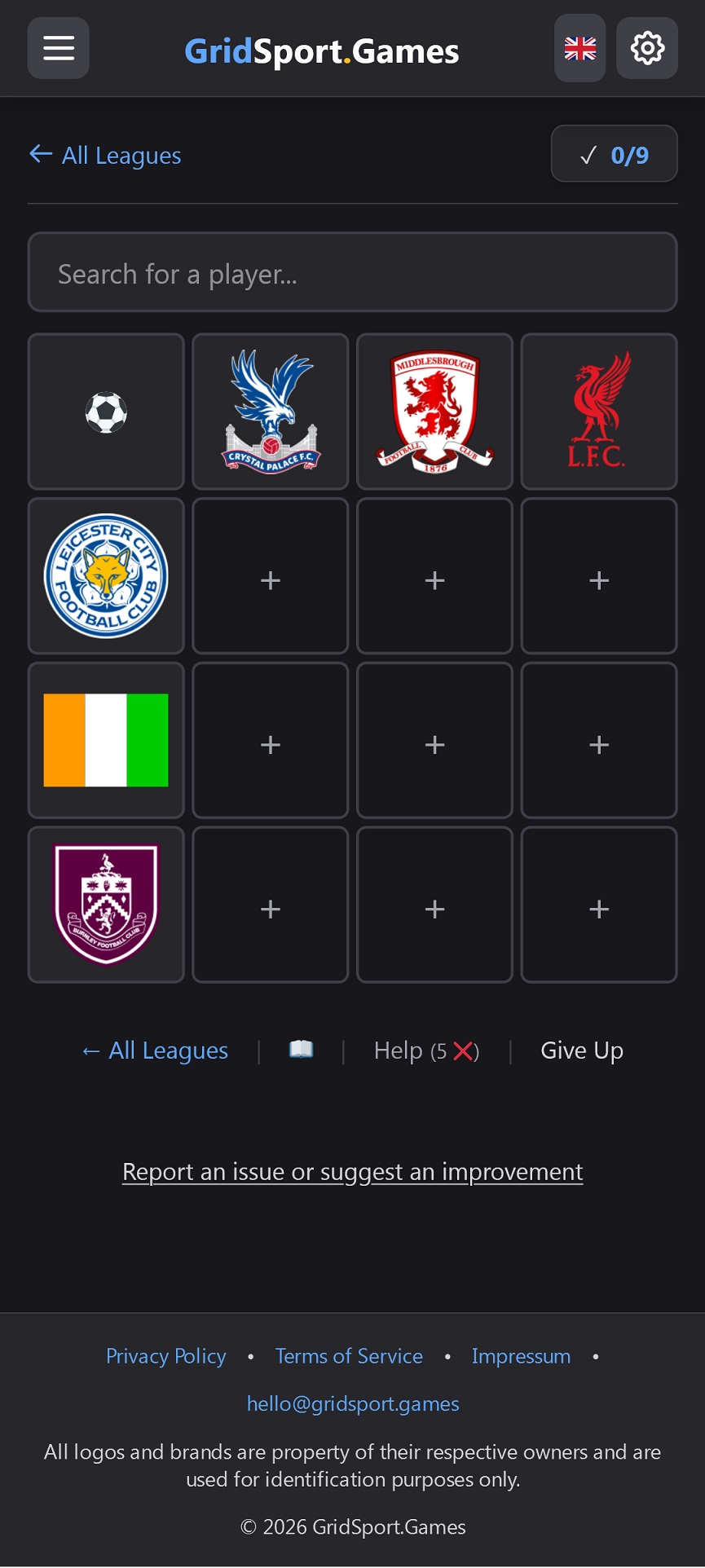 GridSport.Games is a free daily puzzle platform for sports fans. Test your football (soccer) knowledge with our puzzle games! New challenges are released every day at 5:00 UTC (6:00 CET / 7:00 CEST).